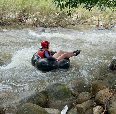 The river tubing adventure started gently, allowing us to get comfortable with our tubes. As we floated along, the tranquil surroundings provided a moment to relax and take in the breathtaking scenery. The gentle current carried us through lush greenery, with the sounds of water and nature.